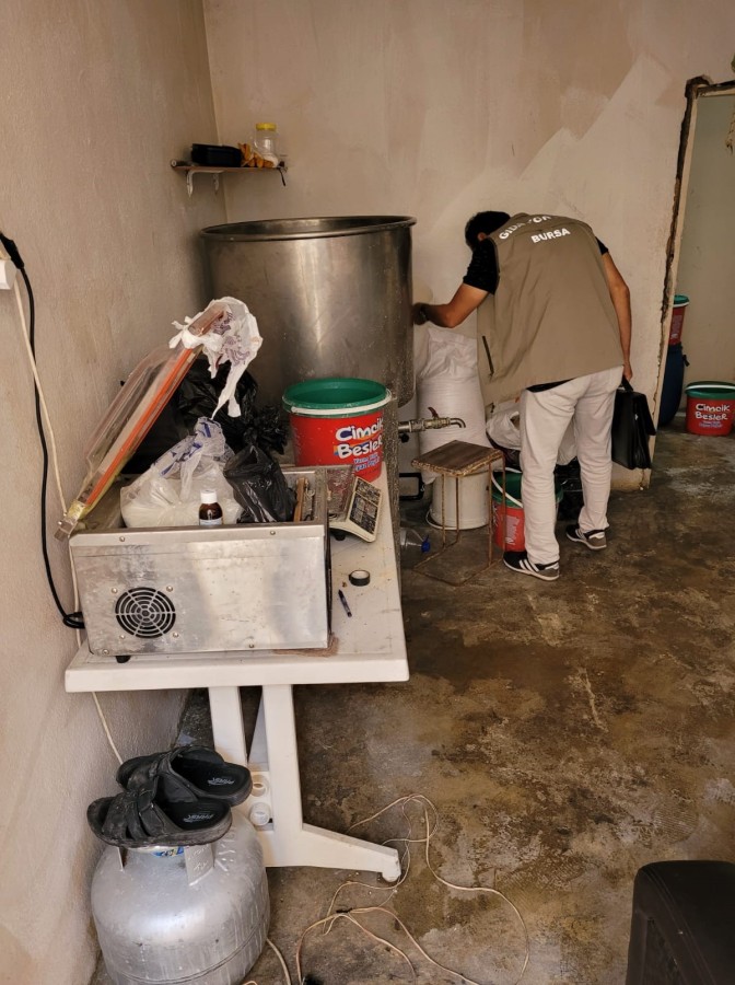 Osmangazi Belediyesi Zabıta Müdürlüğü ekipleri yabancı uyruklu bir kişi tarafından ruhsatsız işletilen süt ve süt ürünleri imalathanesine ihbar üzerine baskın yaptı.