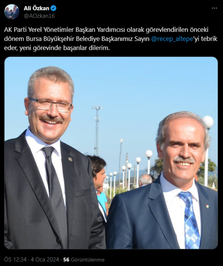 Önceki dönem Bursa Büyükşehir Belediye Başkanı Recep Altepe AK Parti Yerel Yönetimler Başkan Yardımcısı olarak görevlendirildi.
