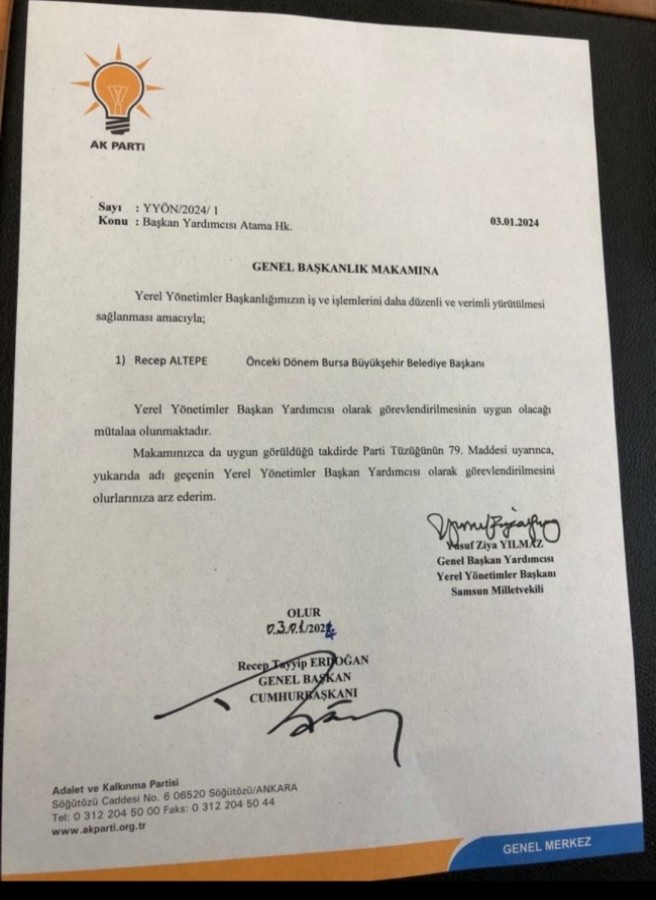 Bursa Büyükşehir Belediyesi başkanlığı görevini 30 Mart 2009 - 23 Ekim 2017 tarihleri arasında yürüten Recep Altepe, Cumhurbaşkanı Recep Tayyip Erdoğan'ın isteği üzerine istifa etmişti. 31 Mart 2024 Pazar günü yapılacak Mahalli İdareler Seçimleri öncesinde yaşanan gelişmeyle Altepe, AK Parti Yerel Yönetimler Başkanı Yusuf Ziya Yılmaz'ın yardımcılığına getirildi.
