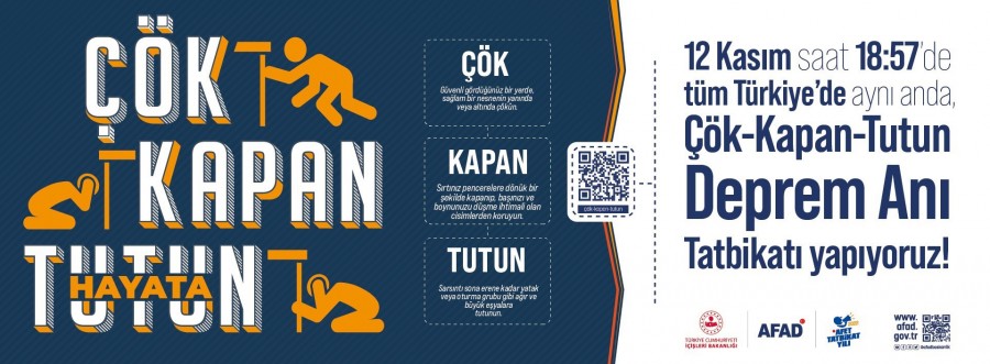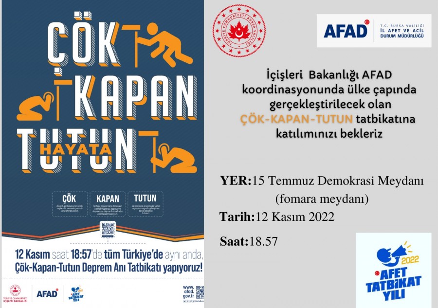 81 il ve ilçelerinde eş zamanlı olarak gerçekleştirilecek olan tatbikat, 12 Kasım 2022 Cumartesi günü saat 18.57'de 'Çök-Kapan-Tutun' hareketi ile uygulanacak. Tatbikat bitiminde Bursa Osmangazi ilçesi 15 Temmuz Demokrasi Meydanında İl Müftüsü Yavuz Selim Karabayır tarafından Türkiye'de meydana gelen tüm afetlerde hayatını kaybeden vatandaşlar için dua edilecek.