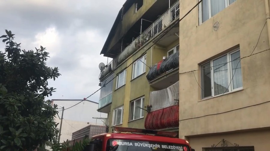 Bursa'da 3 katlı binanın en üst katında başlayan yangın bir anda büyüdü. Evde bulunan 2 kişi yangından etkilendi.