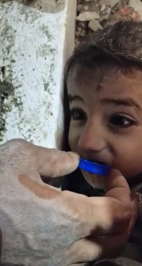 Enkaz altında susayan bebeğe şişenin kapağıyla su verdiler. Enkazdan çıkartılan bebek sağlık ekiplerine teslim edildi.
