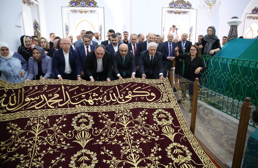 Bursa Büyükşehir Belediyesi tarafından restorasyonu tamamlanarak geçtiğimiz yıllarda ziyarete açılan Osmanlı'nın 4'üncü padişahı Yıldırım Bayezid'e ait 618 yıllık türbenin yenilenen puşide örtüsü, düzenlenen törenle yerine serildi.
