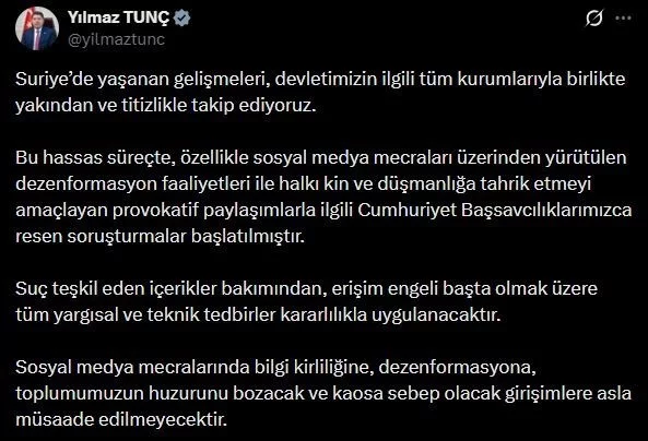Adalet Bakanı Yılmaz Tunç, sosyal medya hesabından yaptığı açıklamada, Suriye'de yaşanan gelişmeleri Türkiye'nin ilgili tüm kurumlarıyla yakından ve titizlikle takip ettiklerini belirtti. Bakan Tunç, özellikle sosyal medya üzerinden yürütülen dezenformasyon faaliyetleri ve halkı kin ile düşmanlığa tahrik etmeyi amaçlayan provokatif paylaşımlarla ilgili Cumhuriyet Başsavcılıklarınca resen soruşturmalar başlatıldığını duyurdu.
