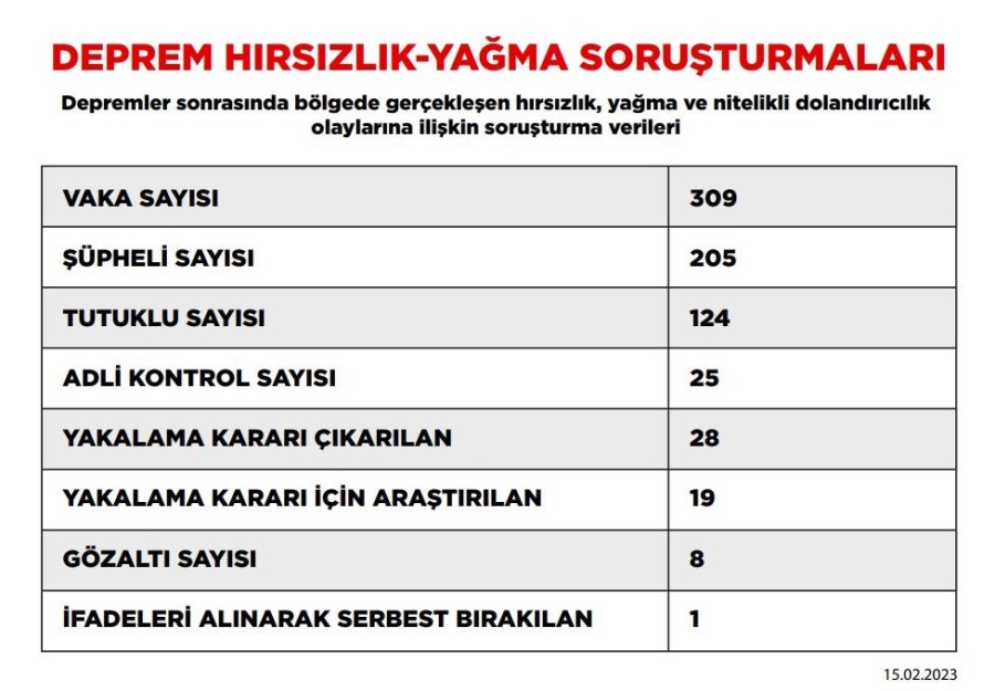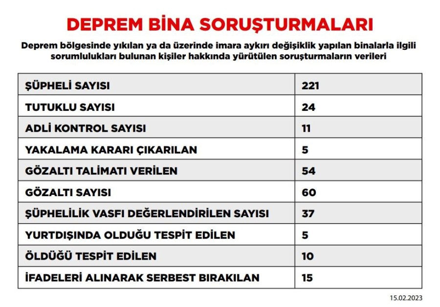 Buna göre; Kahramanmaraş merkezli 10 ili etkileyen depremlerin ardından depremden etkilenen bina soruşturmaları çerçevesinde 221 şüpheli şahıstan 24'ü tutuklandı.