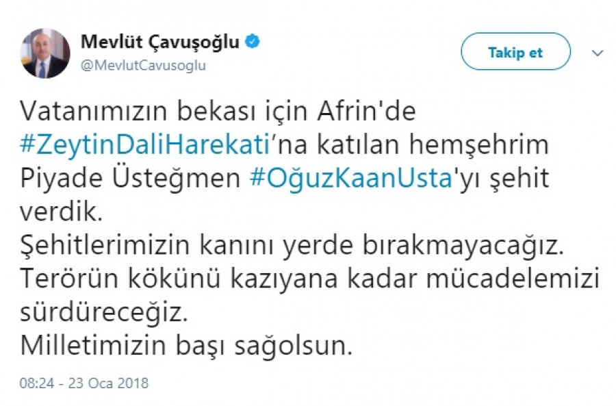 Şehit haberini sosyal medya hesabı Twitter'dan duyurun Dışişleri Bakanı Çavuşoğlu şu ifadeleri kullandı; 'Vatanımızın bekası için Afrin'de #ZeytinDaliHarekati'na katılan hemşehrim Piyade Üsteğmen #OğuzKaanUsta'yı şehit verdik. Şehitlerimizin kanını yerde bırakmayacağız. Terörün kökünü kazıyana kadar mücadelemizi sürdüreceğiz. Milletimizin başı sağolsun.'