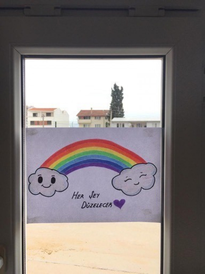 Bursa'da bir anaokulunun başlattığı, çocuklar tarafından yapıldıktan sonra evlerin camlarına asılan gökkuşağı resmi akımı Türkiye'nin dışında dünyanın birçok yerinde paylaşılmaya başlandı.