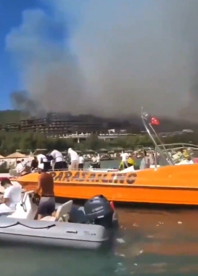 Muğla'nın Bodrum ilçesinde otellere yakın bir noktada çıkan yangın otelleri tehdit edecek boyuta ulaşınca, otel müşterileri denizden tahliye edilmeye başlandı.