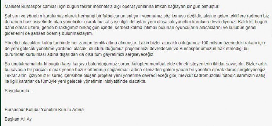 Bursaspor Kulübü Başkanı Ali Ay, oyuncu satışlarıyla ilgili açıklamada bulundu.