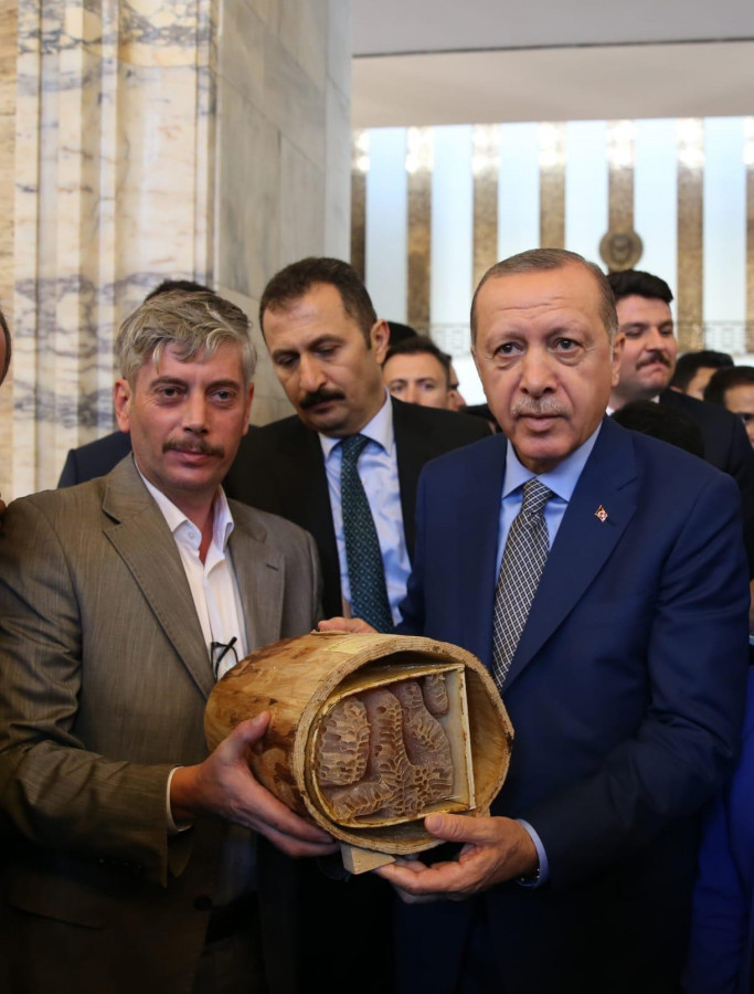 Şemsettin Kahyaoğlu, peteği Cumhurbaşkanı Recep Tayyip Erdoğan'na hediye etti. AK Parti'nin grup toplantısına giden Kahyaoğlu, Erdoğan'la görüşme imkanı buldu. Balı kendisine veren Kahyaoğlu, "30 Ekim tarihinde milletvekilimiz Vildan hanım cumhurbaşkanımızdan randevu talep etti. Cumhurbaşkanımız sağolsun bizleri kırmadı. Dün grup toplantısı çıkışında meclis hasbahçesinde kendisine balımızı hediye ettik. Baktı, çokta hoşuna gitti. Biz de mutlu olduk. Daha önce kendisi böyle bir bal görmemiş" dedi.