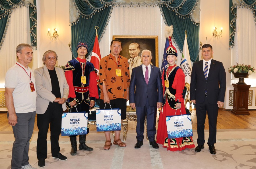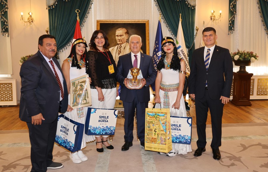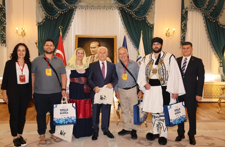 Bursa Büyükşehir Belediyesi tarafından bu yıl 37'ncisi düzenlenen Uluslararası Altın Karagöz Halk Dansları Yarışması'na katılan ekiplerin temsilcileri, Başkan Mustafa Bozbey'i ziyaret ederek ülkelerinin sembol hediyelerini sundu.