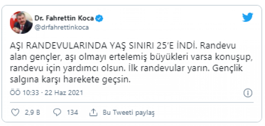 Aşılamada yaş sınırı 25'e düştü. Açıklamayı yapan Sağlık Bakanı Fahrettin Koca, "Randevu alan gençler, aşı olmayı ertelemiş büyükleri varsa konuşup, randevu için yardımcı olsun" dedi.