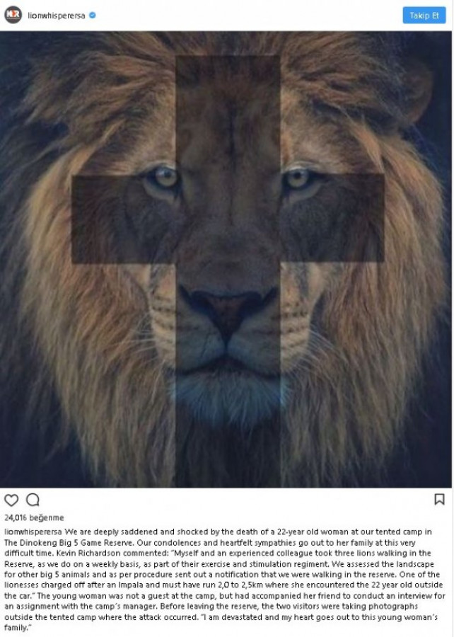 "Çalışma arkadaşlarımla 3 aslanın bakımıyla ilgileniyorduk," diyen Richardson, "Diğer büyük hayvanların uzağında aslanları takip ettiğimiz sırada, bir dişi aslan, peşinde olduğu impalayı kovalarken aracının dışındaki genç kıza saldırdı. Mahvolmuş durumdayım ve genç kızın ailesinin acısını yürekten paylaşıyorum."dedi.