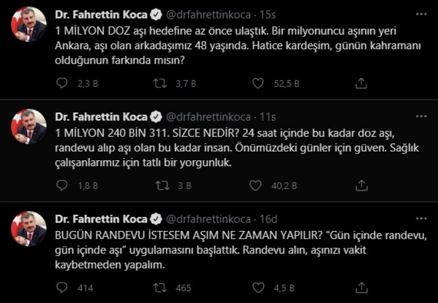 "Bugün randevu istesem aşım ne zaman yapılır? 'Gün içinde randevu, gün içinde aşı' uygulamasını başlattık. Randevu alın, aşınızı vakit kaybetmeden yapalım.''