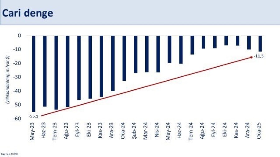 Hazine ve Maliye Bakanı Mehmet Şimşek, sosyal medya hesabından ocak ayı cari açık verilerine ilişkin değerlendirmede bulundu. Cari açığın sürdürülebilir seviyede kalmasını beklediklerini belirten Şimşek, "Yıllık cari açık ocakta 11,5 milyar dolar oldu. Önümüzdeki dönemde artmasını öngördüğümüz cari açığın yıl genelinde OVP tahmini olan 28,6 milyar dolar ve milli gelire oranla yüzde 2'nin altında, sürdürülebilir seviyede kalmasını bekliyoruz. Brüt dış finansman ihtiyacının milli gelire oranı, cari açıktaki düşüşün de katkısıyla son iki yılda 5,4 puan iyileşerek yüzde 18,6 ile uzun dönem ortalamasının altına geriledi. Böylece dış dengeye ilişkin kırılganlıkları önemli ölçüde bertaraf ederek ekonomimizi daha dirençli ve güçlü hale getirdik. Sürdürülebilir cari denge ve uzun vadeli kaynak ile dış finansman ihtiyacını azaltmaya ve finansmanın kalitesini iyileştirmeye devam edeceğiz" dedi.