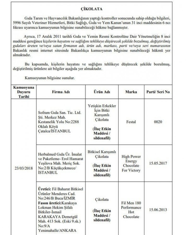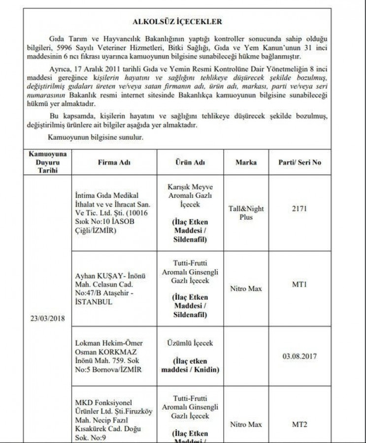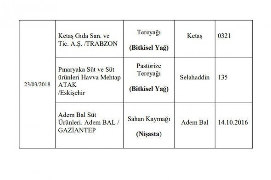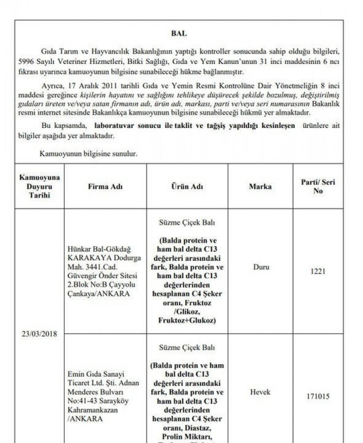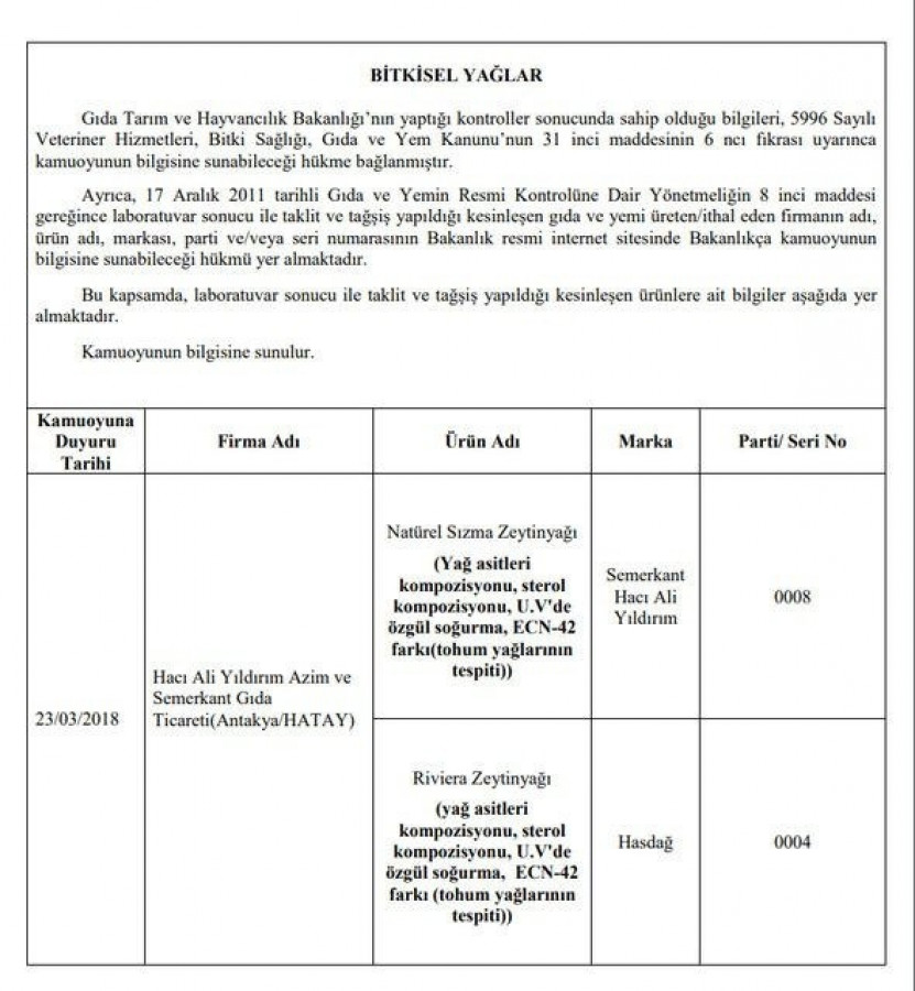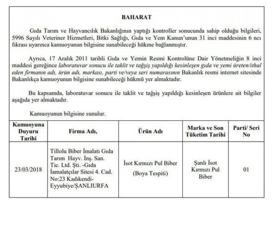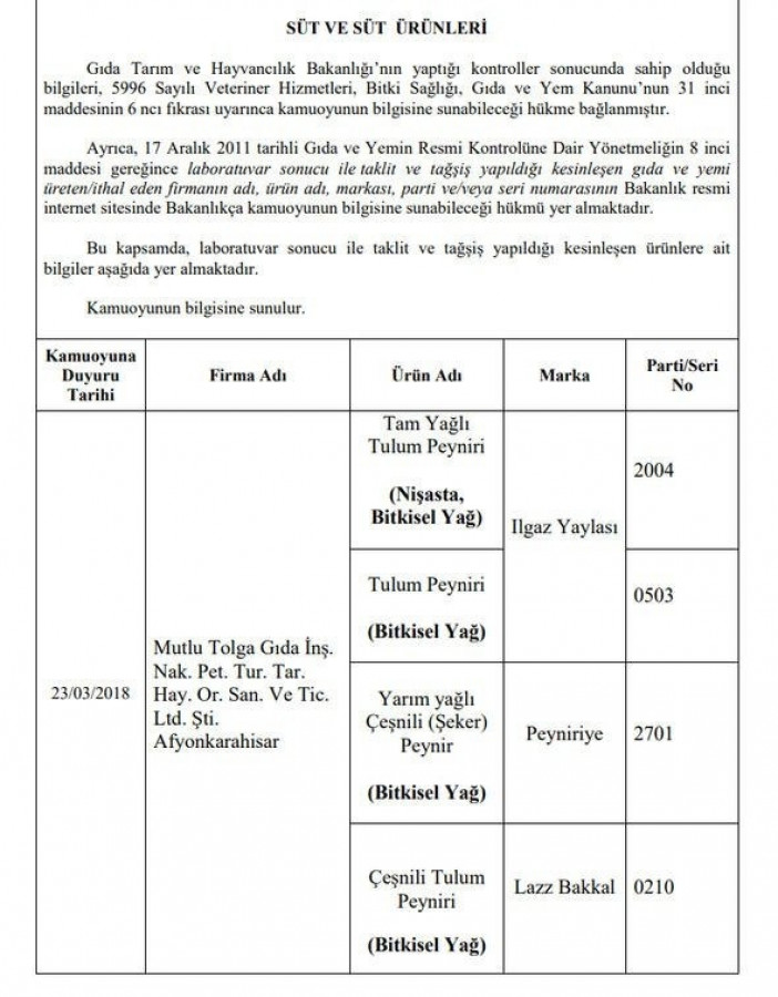 "5996 sayılı "Veteriner Hizmetleri, Bitki Sağlığı, Gıda ve Yem Kanunu" ve bu Kanun kapsamında hazırlanan, "Gıda ve Yemin Resmi Kontrollerine Dair Yönetmelik" gereğince; laboratuvar sonucuyla taklit veya tağşiş yapıldığı kesinleşen gıdaları üreten/ithal eden; kişilerin hayatını ve sağlığını tehlikeye düşürecek şekilde bozulmuş, değiştirilmiş gıdaları üreten ve/veya satan firmanın adı, ürün adı, markası, parti ve/veya seri numarasını içeren bilgiler kamuoyunun bilgisine sunulmaktadır.