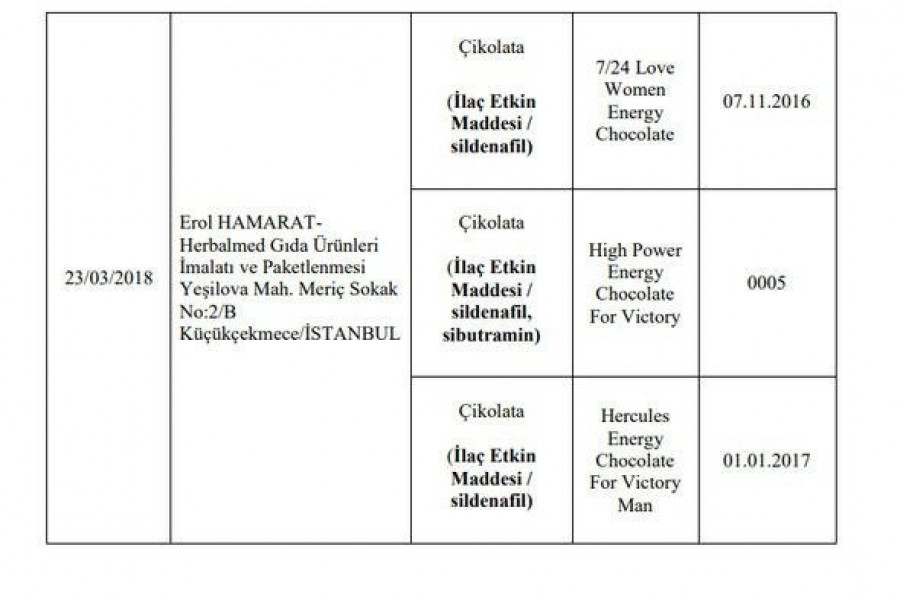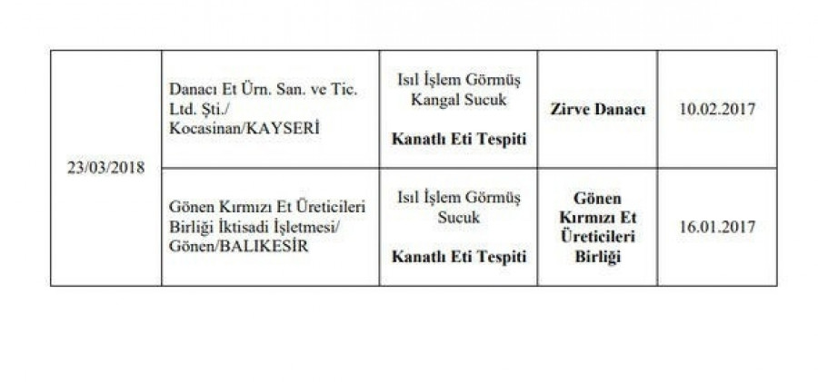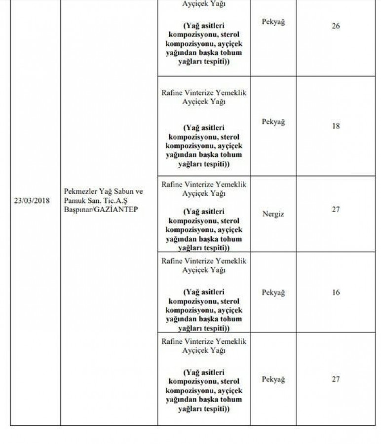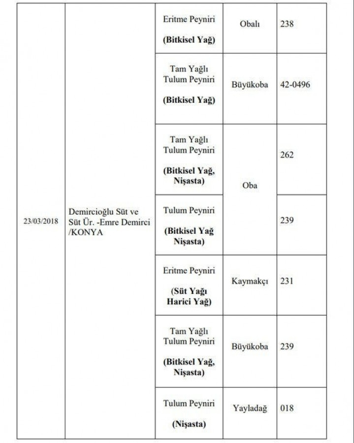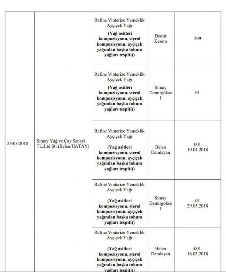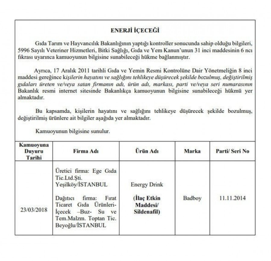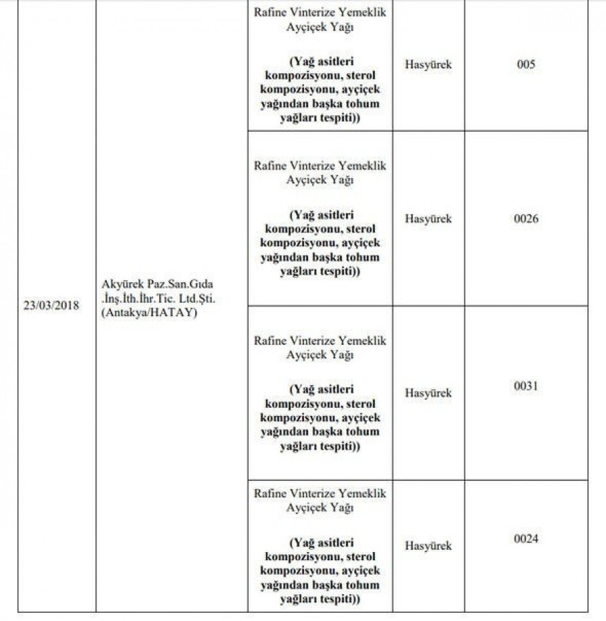 "5996 sayılı "Veteriner Hizmetleri, Bitki Sağlığı, Gıda ve Yem Kanunu" ve bu Kanun kapsamında hazırlanan, "Gıda ve Yemin Resmi Kontrollerine Dair Yönetmelik" gereğince; laboratuvar sonucuyla taklit veya tağşiş yapıldığı kesinleşen gıdaları üreten/ithal eden; kişilerin hayatını ve sağlığını tehlikeye düşürecek şekilde bozulmuş, değiştirilmiş gıdaları üreten ve/veya satan firmanın adı, ürün adı, markası, parti ve/veya seri numarasını içeren bilgiler kamuoyunun bilgisine sunulmaktadır.
