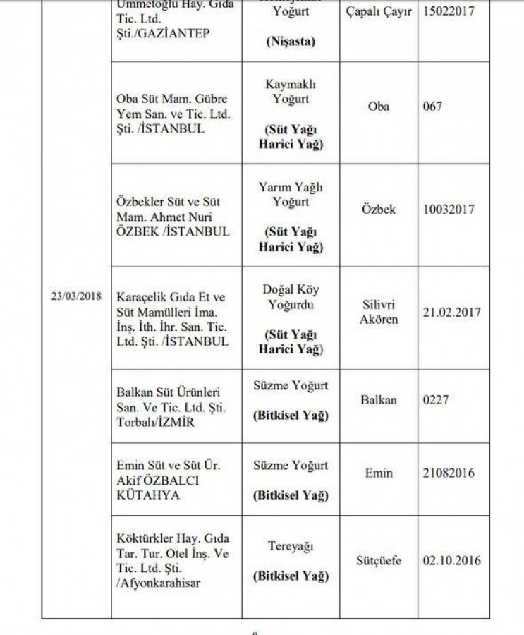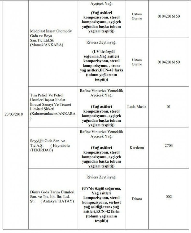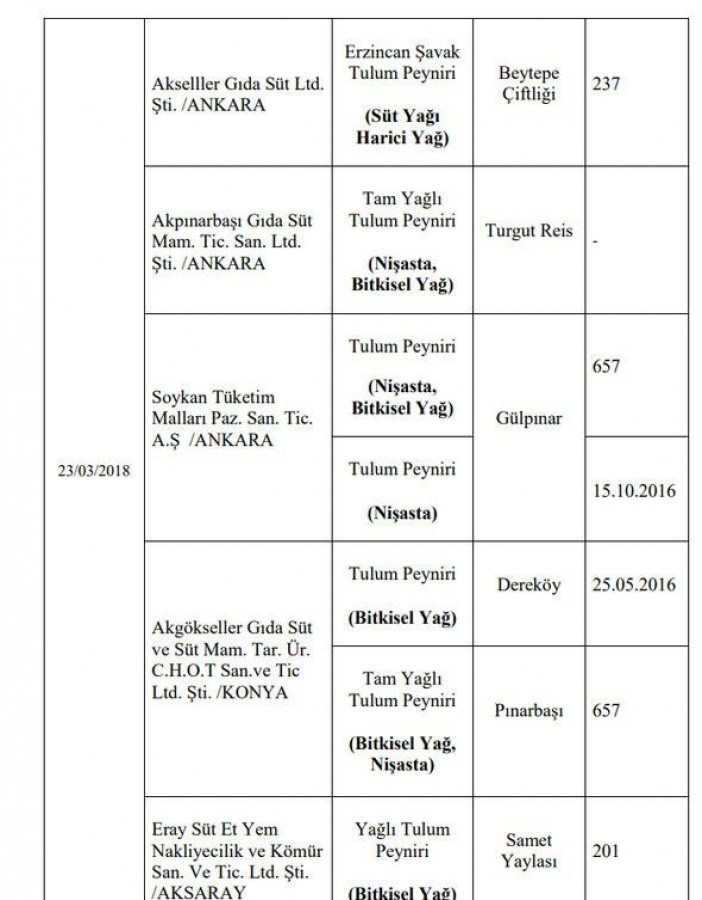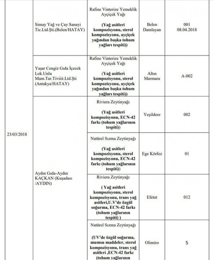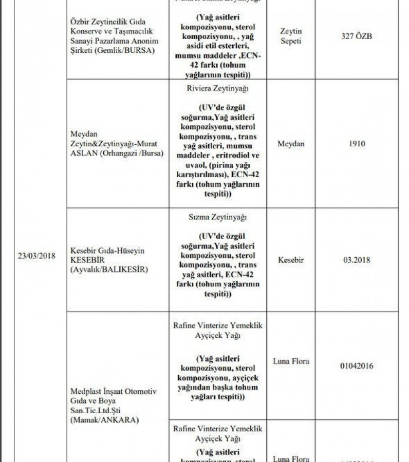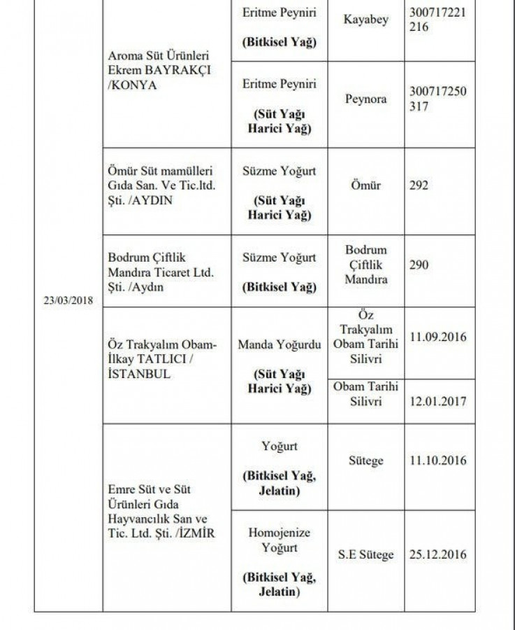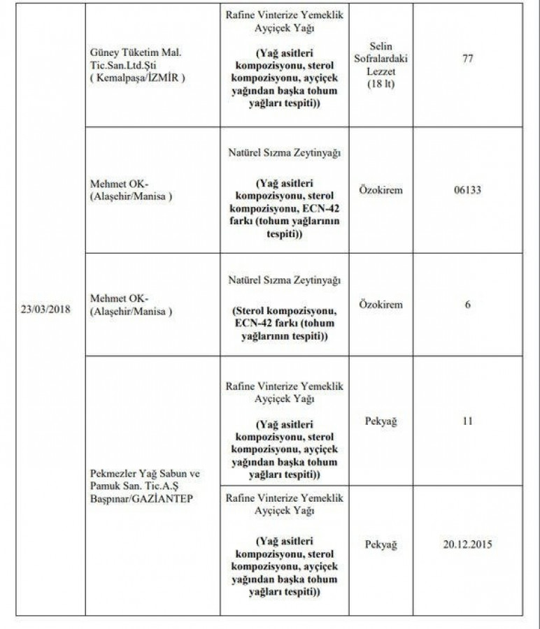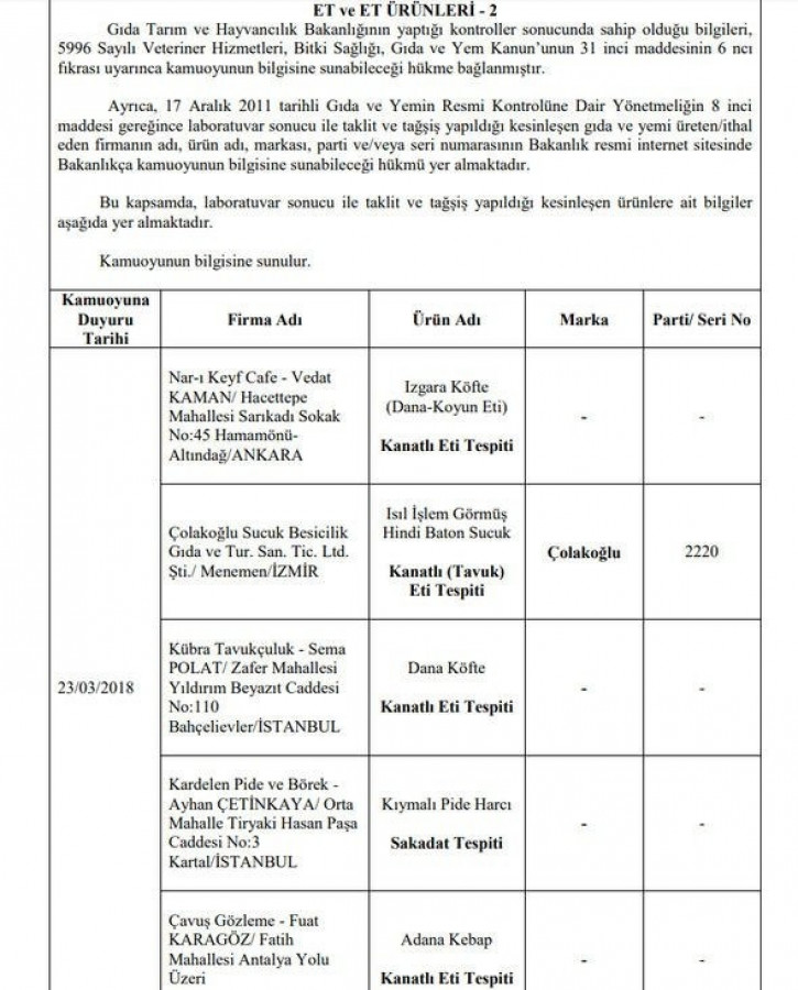 Gıda, Tarım ve Hayvancılık Bakanlığı tarafından, taklit veya tağşiş yapıldığı kesinleşen, aralarında et ve et ürünleri, süt ve süt ürünleri, bitkisel yağ, bal, takviye edici gıdalar, çikolata ve enerji içeceğinin yer aldığı 173 firmaya ait 282 parti ürün kamuoyuna açıklandı.