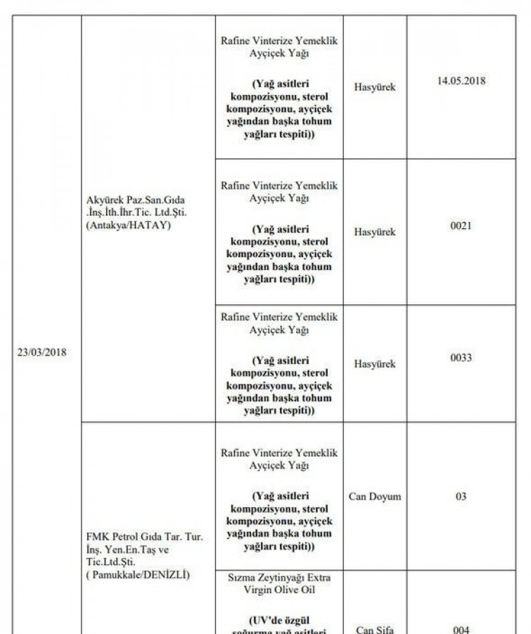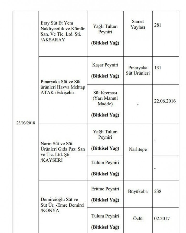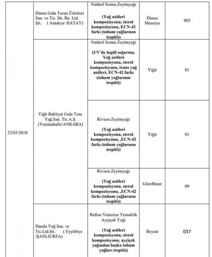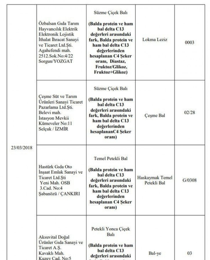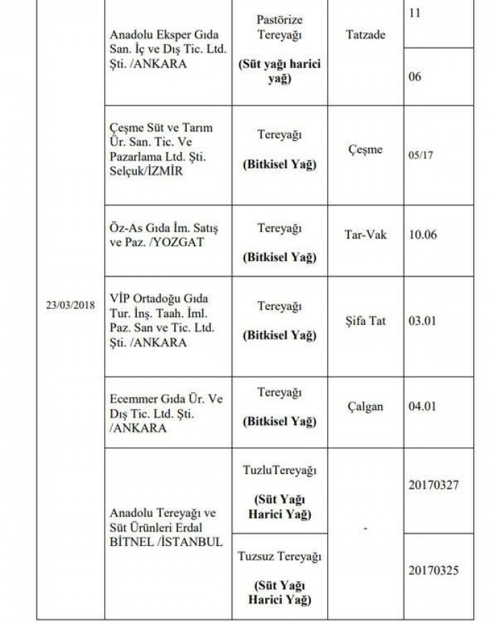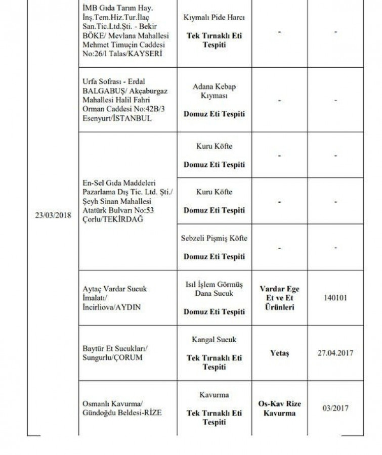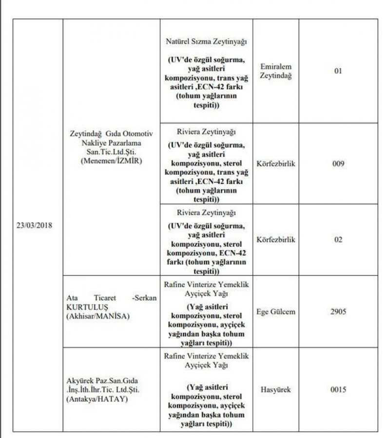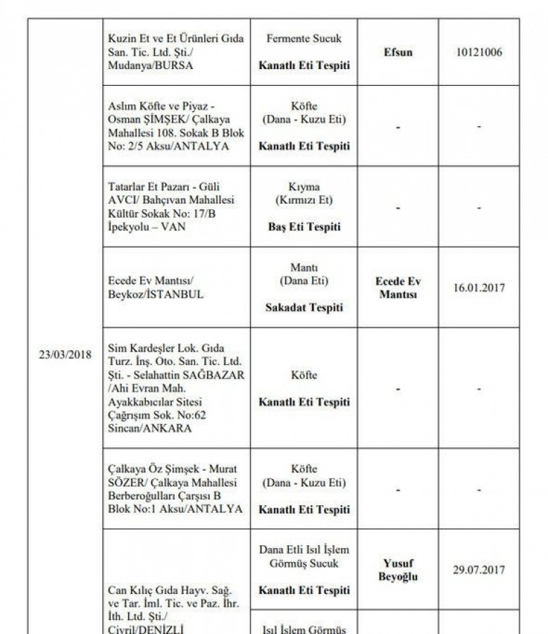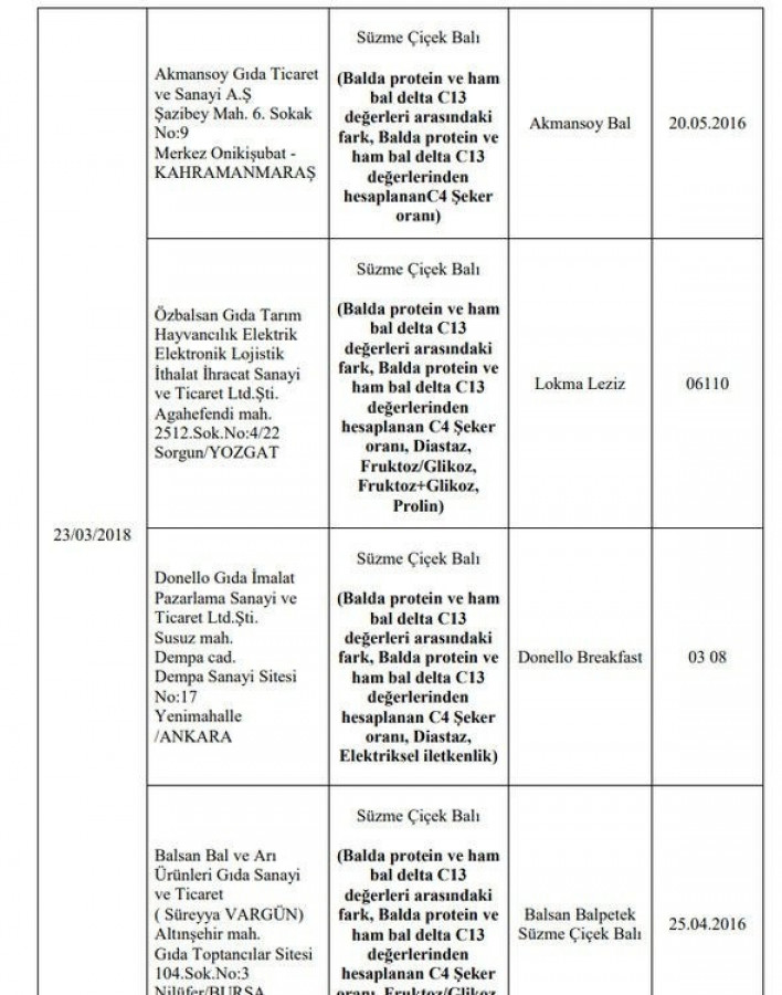 Gıda, Tarım ve Hayvancılık Bakanlığı tarafından, taklit veya tağşiş yapıldığı kesinleşen, aralarında et ve et ürünleri, süt ve süt ürünleri, bitkisel yağ, bal, takviye edici gıdalar, çikolata ve enerji içeceğinin yer aldığı 173 firmaya ait 282 parti ürün kamuoyuna açıklandı.