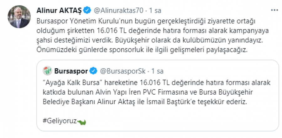 Başkan Alinur Aktaş da Twitter hesabından, "Bursaspor Yönetim Kurulu'nun bugün gerçekleştirdiği ziyarette ortağı olduğum şirketten 16.016 TL değerinde hatıra forması alarak kampanyaya şahsi desteğimizi verdik. Büyükşehir olarak da kulübümüzün yanındayız. Önümüzdeki günlerde sponsorluk ile ilgili gelişmeleri paylaşacağız." dedi