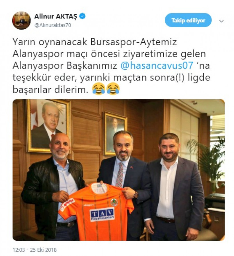 Twitter hesabından fotoğraf ile paylaşımda bulunan Aktaş'ın şu mesajı gülümsetti: "Yarın oynanacak Bursaspor-Aytemiz Alanyaspor maçı öncesi ziyaretimize gelen Alanyaspor Başkanımız @hasancavus07'na (Hasan Çavuşoğlu) teşekkür eder, yarınki maçtan sonra(!) ligde başarılar dilerim."