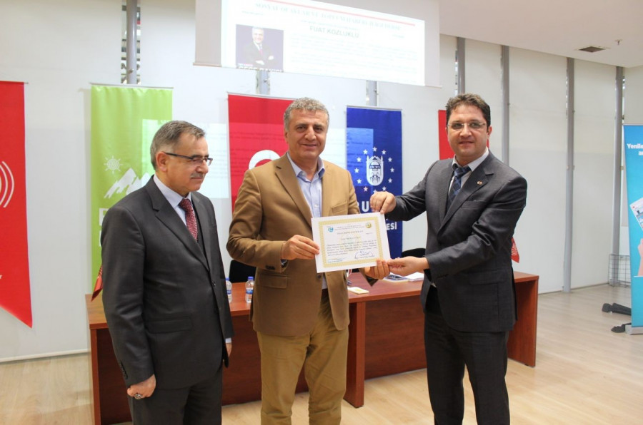Basın İlan Kurumu Bursa Şube Müdürü Osman Başeğmez söyleşinin sonunda Bursa İl Müftüsü İzani Turan ve usta gazeteci Fuat Kozluklu'ya adlarına Bursa Plaket Hatıra Ormanlığında dikilen fidan sertifikasını verdi.