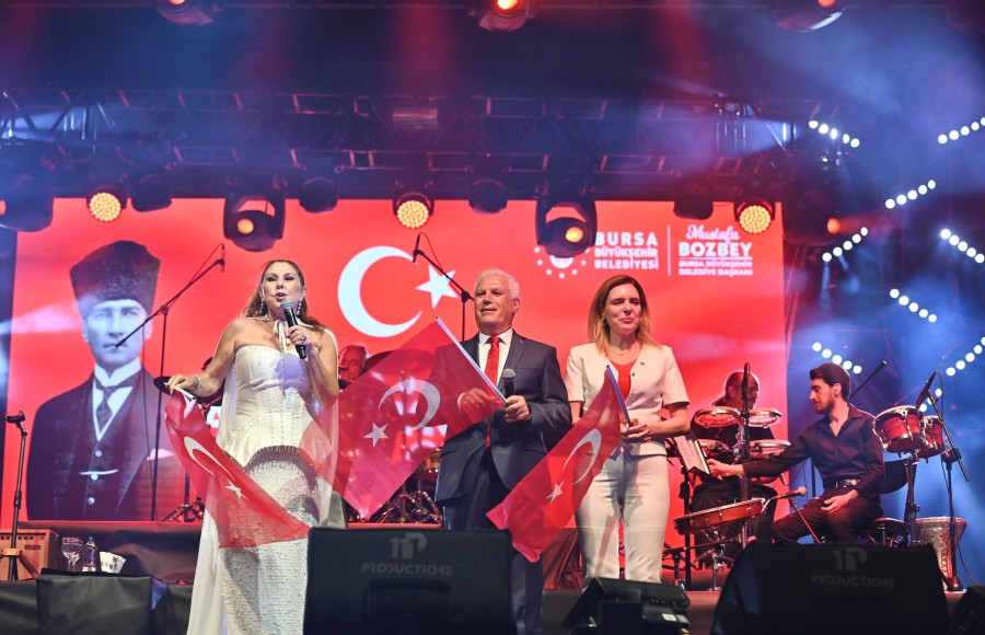 Konuşmanın ardından Başkan Bozbey, eşi Seden Bozbey ile alanı dolduran binlerce Bursalıyı Türk Bayrağı ile selamladı. Ardından usta sanatçı Nilüfer sahne alarak sevilen şarkılarını seslendirdi.