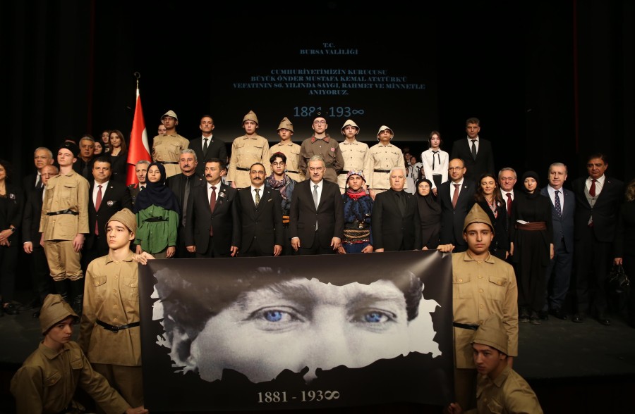 Ulu Önder Gazi Mustafa Kemal Atatürk, ebediyete intikalinin 86. yıl dönümünde tüm yurtta olduğu gibi Bursa'da da törenlerle anıldı. Bursa Valiliği tarafından Heykel'de düzenlenen anma programı, Bursa Valiliği, Bursa Büyükşehir Belediyesi ve Garnizon Komutanlığı'na ait çelenklerin Atatürk Heykeli'ne sunulmasıyla başladı. Saatler 09.05'i gösterdiğinde sirenlerin çalmasıyla birlikte Bursa'da hayat iki dakikalığına tamamen durdu. Vatandaşlar araçlarından inerek saygı duruşunda bulunurken, bazı vatandaşlar da törene cam ve balkonlarından eşlik etti. Saygı duruşu, İstiklâl Marşı'nın okunmasının ardından Vali Erol Ayyıldız, Büyükşehir Belediye Başkanı Mustafa Bozbey ve protokol üyeleri Büyükşehir Belediyesi tarafından Tayyare Kültür Merkezi'nde açılan 'Sonsuzluğun Öyküsü-Mustafa Kemal Atatürk' sergisini gezdi. Atatürk'ün Bursa gezilerinde çekilen fotoğraflarının da yer aldığı sergi, büyük ilgi gördü. Vali Erol Ayyıldız, Büyükşehir Belediye Başkanı Mustafa Bozbey ve protokol üyeleri, daha sonra Hasan Ali Yücel Anadolu Lisesi öğrencilerinin hazırladığı 'Atatürk Oratoryosu' ve dramatize gösteriyi izledi. Öte yandan Atatürk'ü Anma Haftası etkinlikleri kapsamında Kültür ve Sosyal İşler Dairesi Başkanlığı Orkestra Şube Müdürlüğü tarafından Hanlar Bölgesi'nde mini bir konser verildi. BURULAŞ tarafından hazırlanan 'Sonsuzluğu Atamızdan Öğrendik" fotoğraf sergisi ise Merinos İstasyonu'nda açıldı.