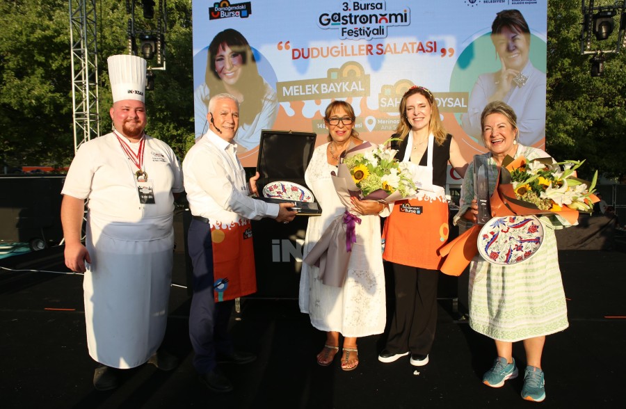 Bursa Büyükşehir Belediyesi'nin 'Damağımdaki Bursa' temasıyla bu yıl üçüncüsünü düzenlendiği Bursa Uluslararası Gastronomi Festivali, kentin unutulmaya yüz tutmuş lezzetlerini ve zengin mutfak kültürünü gastronomi tutkunlarıyla buluşturmaya devam ediyor. Etkinlik çerçevesinde Sahrap Soysal ve Melek Baykal ile birlikte mutfağa giren Başkan Mustafa Bozbey ve eşi Seden Bozbey, Bursa'nın coğrafi tescilli ürünlerini kullanarak 'Bursa dudugiller salatası' hazırladı.