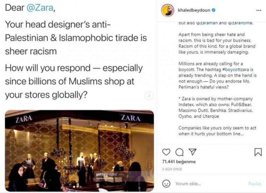 Zara'nın şirket prensipleri gereği hiçbir ayrımcı ve suçlayıcı ifadelere müsaade edilemeyeceği belirtilirken, "Temel değerlerimizi yansıtmayan bu yorumları kınıyoruz" denildi.