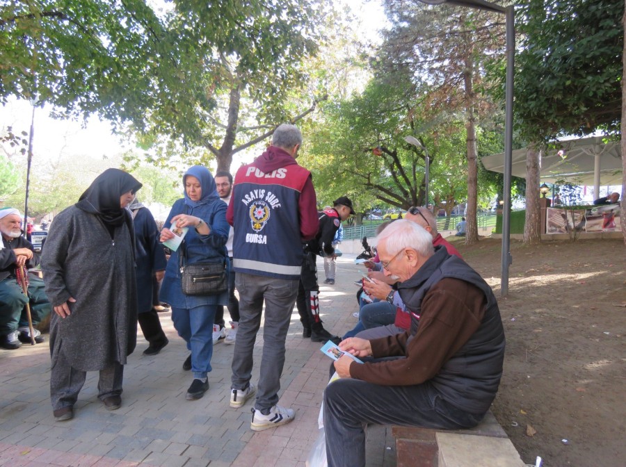 Bursa İl Emniyet Müdürlüğü, Asayiş Şube Müdürlüğü Dolandırıcılık Büro Amirliği koordinesinde dolandırıcılara karşı bilinçlendirme uygulaması yapıldı. Ekipler şehrin en işlek noktalarında broşür dağıtıp, bilgilendirme yaptı. Binlerce vatandaşı bilinçlendiren ekipler kendilerine şüpheli gelen şahıslara yönelik 112 Çağrı Merkezi'nin aranmasını istedi.