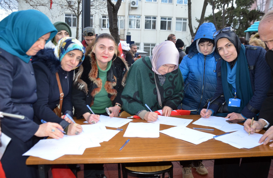 Bursa'da 25'i kadın yaklaşık 100 vatandaş, Suriyeli mülteciler ve bir şehit babası, Afrin'de Zeytin Dalı Harekatı'na destek için askerlik şubesinin önünde toplanarak ihtiyaç halinde askere alınmaları için dilekçe verdi.