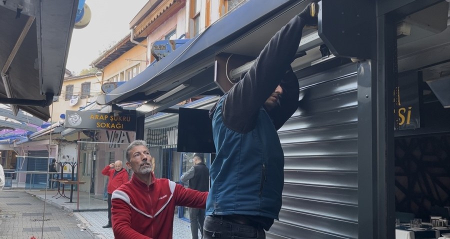 Bursa'nın turistik Arap Şükrü Sokağı'nda işletmelerin uzun süredir kullandığı tenteler ve cam bölmeler, "kaldırım işgali" gerekçesiyle belediye ekipleri tarafından kaldırılmaya başlandı. 14 işletmeye uyarı yapıldı, çevik kuvvet sokakta geniş güvenlik önlemi aldı.