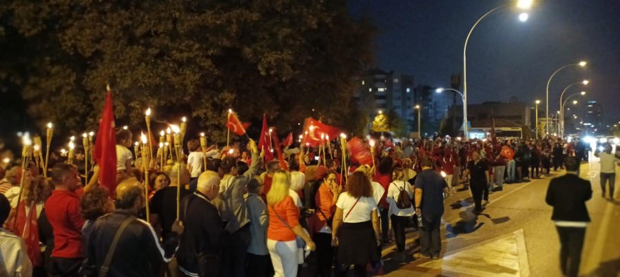Türk bayrakları, meşaleler ve bando ekibi ile Cumhuriyet'in 100'üncü yılını kutlayan kalabalığın güvenliğini polis ekipleri sağlarken, yürüyüş Özlüce Bulvarı'nda bitti.