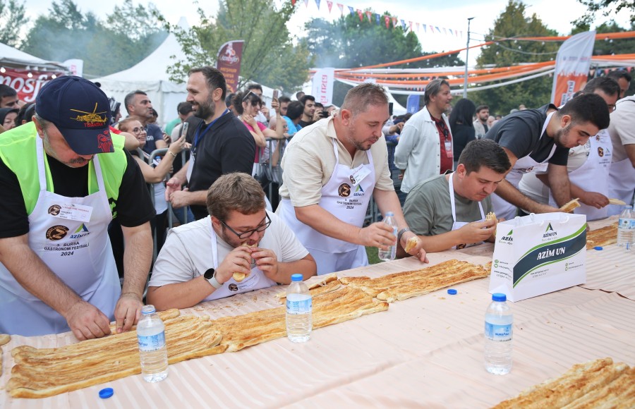 Bursa Büyükşehir Belediyesi tarafından bu yıl 3.'ncüsü düzenlenen Gastronomi Festivali çerçevesinde, en uzun börek yeme yarışması yapıldı. Merinos Atatürk Kongre Kültür Merkezi'nde açık havada yarışmaya katılan vatandaşlara 10 dakika süre tanındı. Kıran kırana geçen yarışmada 10 dakikada ek börek isteyerek 15 metre börek yiyen Ahmet Kılıç birinci oldu. Yarışmada birinci olan Ahmet Kılıç'a 5 gram altın verilirken, ikinci ve üçüncü olanlara çeşitli hediyeler verildi. 52 yarışmacı arasından olan Ahmet Kılıç, "Festival çok eğlenceli geçiyor. Dün baklava yeme yarışmasında 4. oldum. Bugün börek yeme yarışmasında birinciliği aldım. Bunu bekliyordum, daha önceki rekorumu da kırmış oldum. Şampiyon olduğum için mutluyum" diye konuştu.