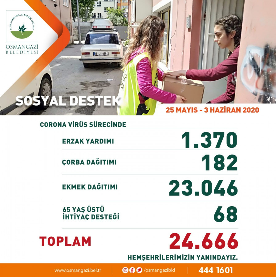 Osmangazi'nin 136 mahallesini kapı kapı gezen belediye ekipleri, 25 Mayıs ile 3 Haziran tarihleri arasında bin 370 erzak, 182 çorba, 23 bin 046 ekmek dağıttı. Bunun yanı sıra evlerinden çıkamayan 68 tane 65 yaş üstü vatandaşa ihtiyaç desteği veren Vefa Sosyal Destek Grubu, böylece toplam 24 bin 666 aileye sosyal yardım sağladı.