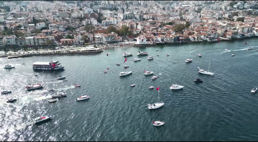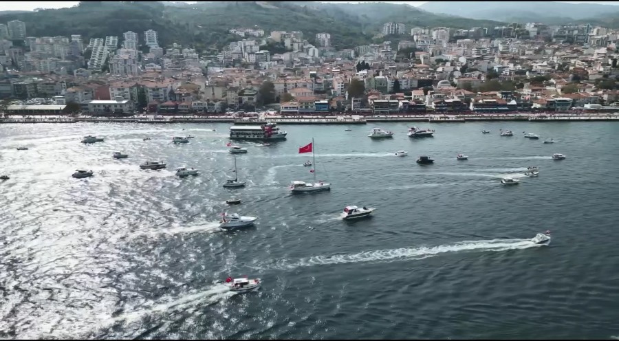 Cumhuriyet'in ilanının 100. yıl dönümü, tüm yurtta olduğu gibi Bursa'da da büyük coşkuyla kutlandı. Mudanya ilçesinde ise denizde onlarca vatandaş, tekneleriyle coşkuya ortak oldu. O anlar havadan görüntülendi.