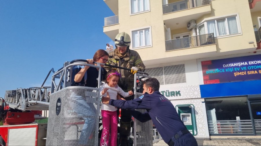 Aileyi fark eden ekipler, itfaiye sepetiyle aralarında çocuklarında bulunduğu aile bir bir aşağı indirerek tahliye etmeye başladı.