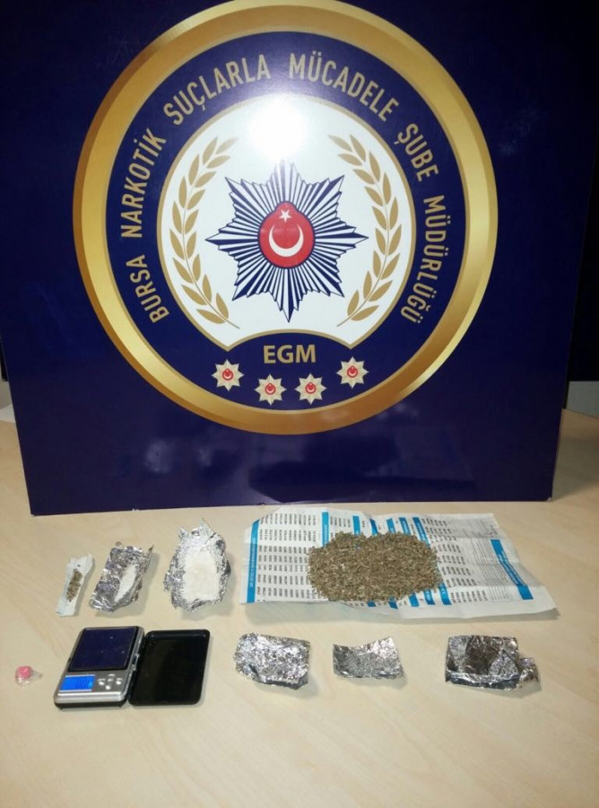 Bursa İl Emniyet Müdürlüğü Narkotik Suçlarla Mücadele Şube Müdürlüğü ekipleri, Bursa genelinde yapılan uyuşturucu tacirlerine karşı operasyon düzenledi. ekipler, şüpheli gördükleri 6 kişinin üzerinde çeşitli miktarlarda sentetik kannabinoid ve metamfetamin ele geçirdi. Yapılan çalışmanın devamında bu kişilere uyuşturucuyu temin ettikleri tespit edilen E.T., F.Ö. ve O.Y.'nin bulunduğu adreslerinde ve araçlarında yapılan aramada satışa hazır vaziyette metamfetamin, sentetik kannobinoid, esrar ve hassas terazi ele geçirildi.