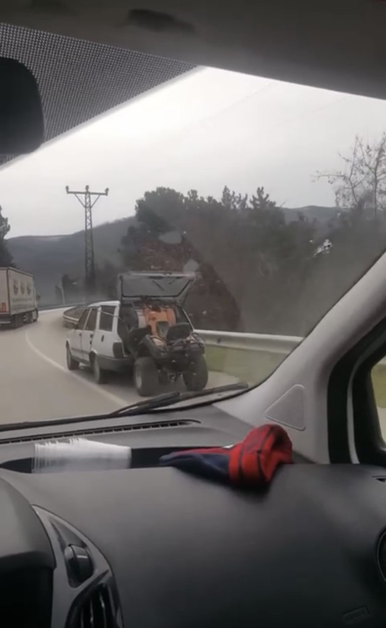 Olay, Keles ilçesinde meydana geldi. Edinilen bilgiye göre, ATV'yi sürmeden başka bir yere götürmek isteyen sahibi ilginç ve tehlikeli bir yöntem denedi. ATV'yi aracının bagajına koyarak götürmek istedi. ATV nin ön tekerlekleri bagajın içinde kalırken arka tekerlekleri dışarıda kaldı.