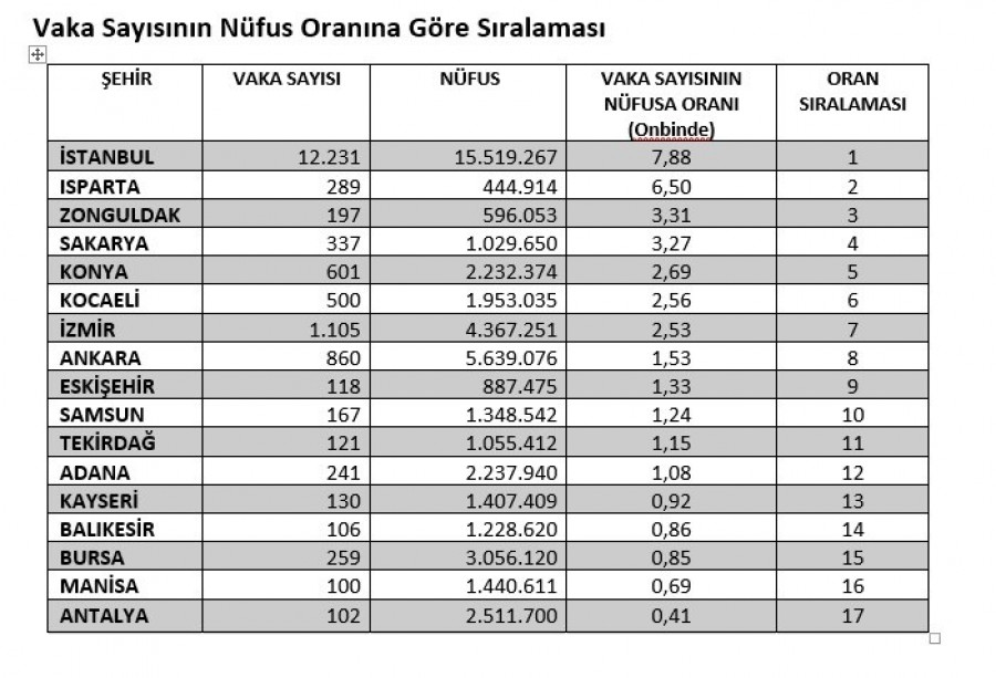 Vaka sayısının nüfus oranına göre sıralamasında ilk 17 şehir şöyle: