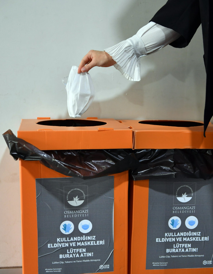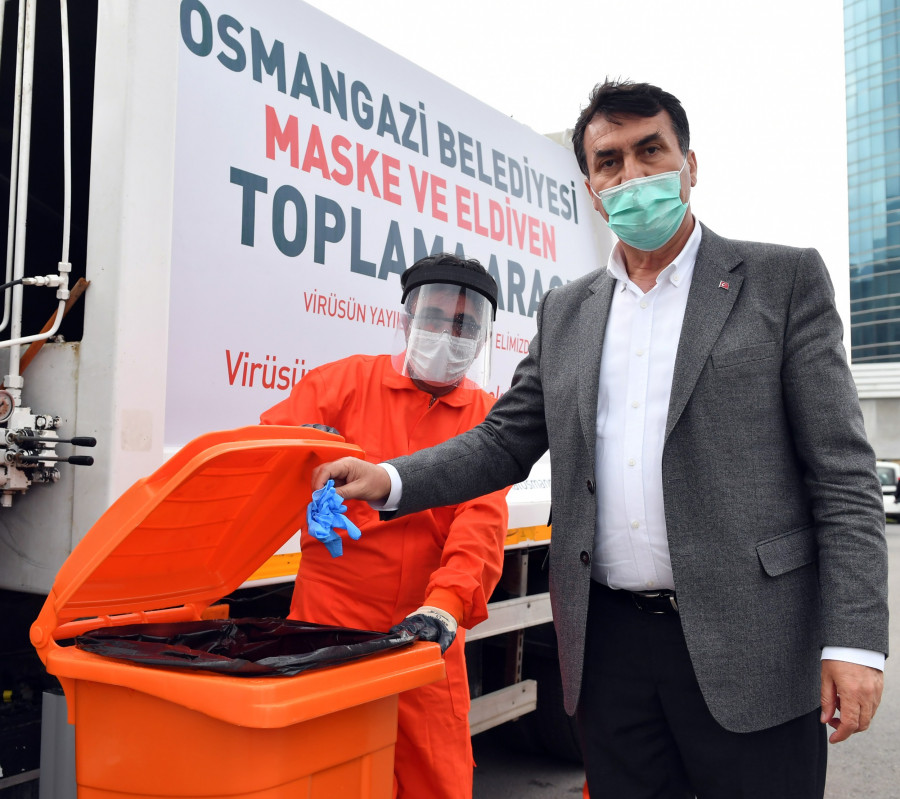 Tüm dünyayı etkisi altına alan korona virüs salgınında vatandaşların ve özellikle sağlık çalışanlarının en önemli tedbir malzemelerinden olan maske ve eldivenlerin, kullanıldıktan sonra toplum sağlığına zarar vermeden toplanması adına Osmangazi Belediyesi örnek bir çalışmaya imza attı. Osmangazi Belediyesi Temizlik İşleri Müdürlüğü, salgın nedeniyle kullanımı artan maske ve eldivenler için atık konteynırları hazırlayarak ilçe genelindeki kamu kurumlarına ve belirli bölgelere yerleştirdi. Kamusal açık ve kapalı alanlar için iki çeşit hazırlanan maske ve eldiven konteynırları, diğer atıklardan ayrı olarak özel bir araçla toplanacak.