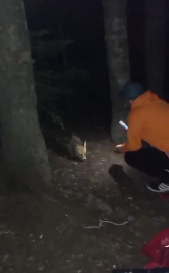 Uludağ'a kamp yapmaya çıkan bir vatandaş, ormanlık alanda gördüğü tilkinin aç olduğunu fark etti.