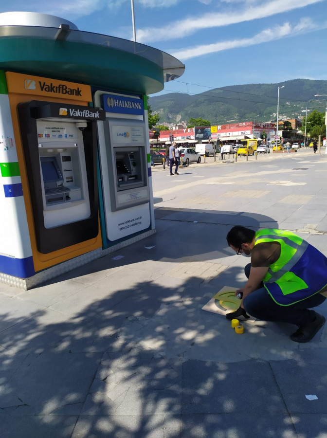 Bursa'da yaptığı çalışmalarla görüntü kirliliğine yol açan trafo binaları ve istinat duvarları gibi alanları birer sanat eserine dönüştüren Bursa Büyükşehir Belediyesi Kent Estetiği Şube Müdürlüğü ekipleri, pandemi sürecinde yeni normalleşmeyle birlikte vatandaşların yoğun olarak kullandıkları alanlara sosyal mesafe işaretlemeleri yaptı.