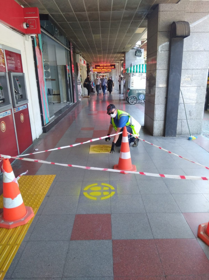 Bursa'nın yeniden yeşille anılan, estetik bir kent olması amacıyla yoğun çaba harcayan Büyükşehir Belediyesi, korona virüs ile etkin mücadelenin ardından şimdi de normalleşme sürecinin sağlıklı ilerlemesi için çalışmalara ağırlık verdi. Bu süreçte sosyal mesafe, maske kullanımı ve kişisel hijyenin ne kadar önemli olduğuna dikkat çeken Büyükşehir Belediyesi, özellikle vatandaşların yoğun olarak kullandıkları alanlarda bazı sosyal mesafe düzenlemelerine başladı. Park ve Bahçeler Dairesi Başkanlığına bağlı Kent Estetiği Şube Müdürlüğü ekipleri de kente değer katan sanat eserlerinin ardından şimdi de pandemi sürecine yoğunlaştı. Yaya trafiğinin yoğun olduğu Altıparmak, Fevzi Çakmak, İnönü, Setbaşı ve Atatürk caddesinde bulunan otobüs durakları, ATM noktaları, bankalar, PTT gibi bekleme alanlarında, sosyal mesafe kurallarına uygun olarak, özel boyalarla işaretleme çalışması yaptı.