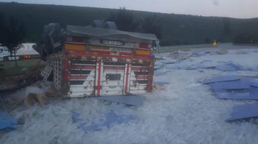 Bursa'da şoförünün hakimiyetini kaybettiği cam şişe yüklü tır yola devrildi. Tırdaki cam şişeler yola saçılırken, Yenişehir-Bursa karayolu yaklaşık 1 saat trafiğe kapalı kaldı.