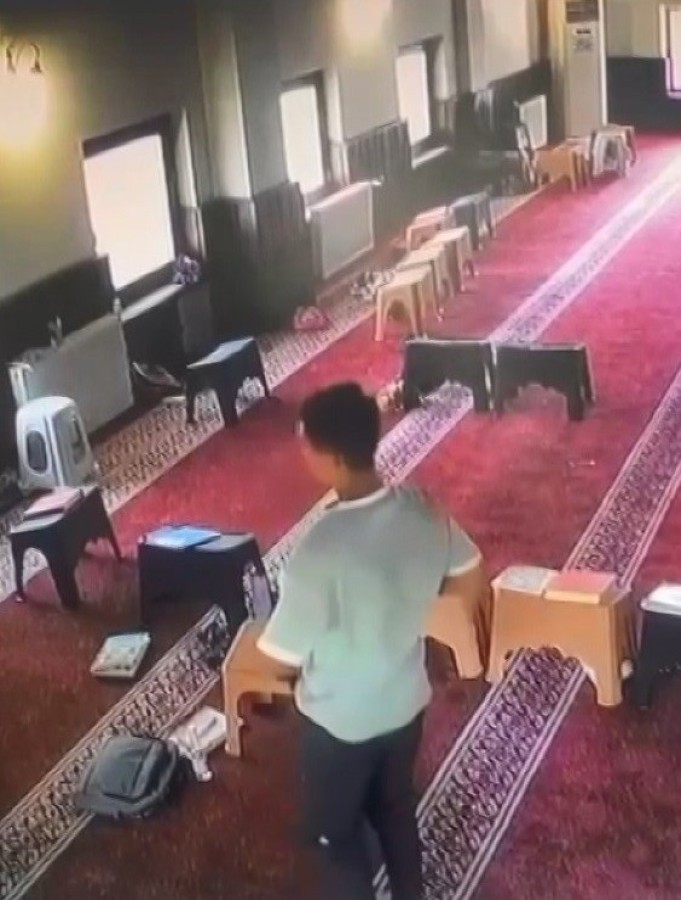Kısa bir süre sonra ise diğer çocuk müsait zamanı bulur bulmaz çantadan çıkardığı laptopu göbeğinin önüne sıkıştırarak camiden çıktı.