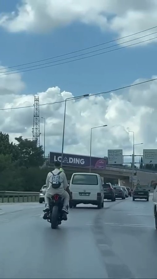 Edinilen bilgiye göre, akan trafikte seyreden bir motosiklet sürücüsünün, bir anda plakası düştü. Ceza yememek için arkasında oturan kişinin sırt çantasına plakasını yapıştıran motosiklet sürücüsünü gören diğer sürücüler, ilginç anları kayda aldı.