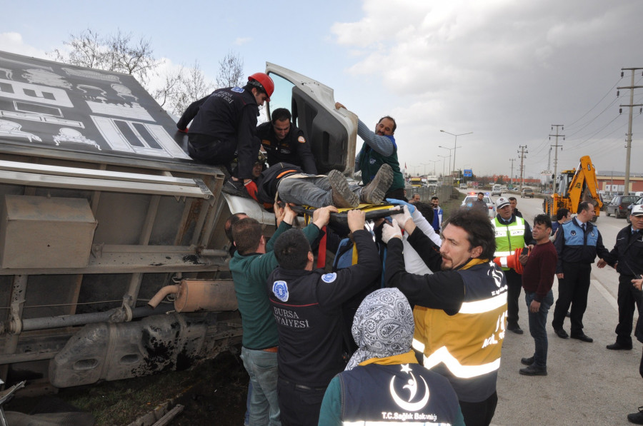 Otomobil sürücüsü Ebru Şirin ile annesi Elif Şirin ve kamyonet sürücüsü Ramazan Çıbık ile yanında bulunan Halil Özal'ın kurtarılması için herkes seferber oldu. Araçlarda sıkışan 4 kişi kaza yerine sevk edilen itfaiye ekiplerince sıkıştıkları yerden kurtarıldı. Yaralılar İnegöl Devlet Hastanesi'ne kaldırıldı. Kaza anı bir işyerinin güvenlik kameralarına saniye saniye yansıdı. Hurdaya dönen otomobil ile kamyonet çekici yardımı ile yoldan kaldırıldı.