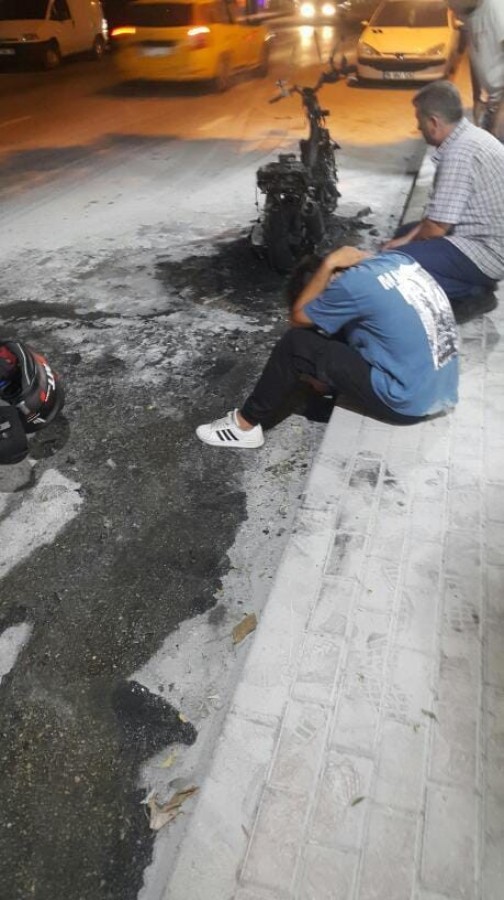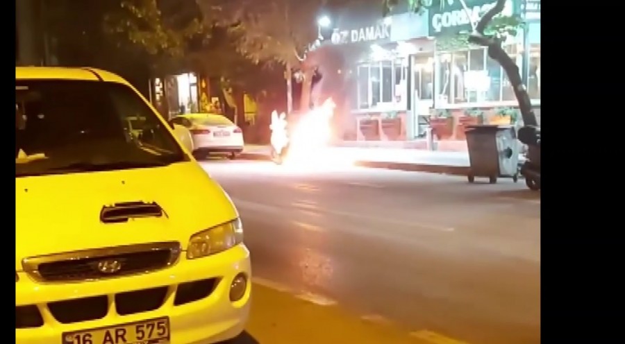Edinilen bilgiye göre, elektrikli bisiklet seyir halindeyken aniden alev aldı. Sürücü alev topuna dönen akülü bisikletten son anda inerek canını kurtardı. Çevredekilerin yardımıyla söndürülen elektrikli bisiklet kullanılmaz hale geldi. Aracının yanışını izleyen genç sürücü kaldırıma oturup gözyaşı döktü.